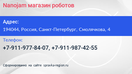 Nanojam, магазин роботов по адресу 194044, Россия, Санкт-Петербург, Смолячкова, 4 в дальнейшем Организация, размещена в следующих категориях: