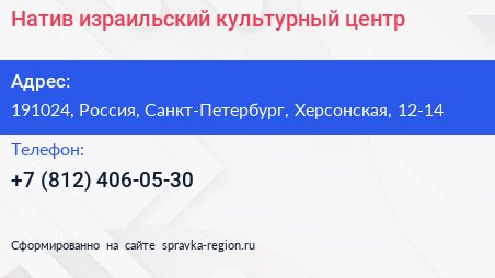 Натив, израильский культурный центр по адресу 191024, Россия, Санкт-Петербург, Херсонская, 12-14 в дальнейшем Организация, размещена в следующих категориях: