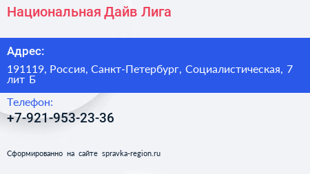 Национальная Дайв Лига по адресу 191119, Россия, Санкт-Петербург, Социалистическая, 7 лит Б в дальнейшем Организация, размещена в следующих категориях: