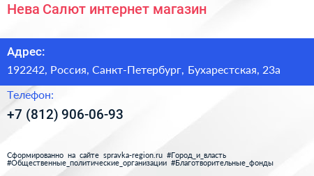 Нева-Салют, интернет-магазин по адресу 192242, Россия, Санкт-Петербург, Бухарестская, 23а в дальнейшем Организация, размещена в следующих категориях: