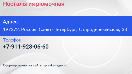 Ностальгия, рюмочная по адресу 197372, Россия, Санкт-Петербург, Стародеревенская, 33 в дальнейшем Организация, размещена в следующих категориях: