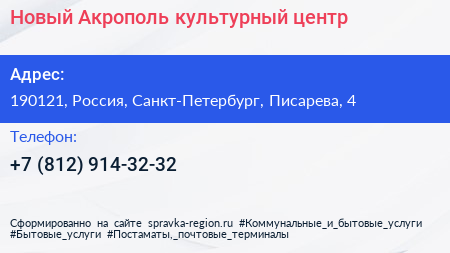 Новый Акрополь, культурный центр по адресу 190121, Россия, Санкт-Петербург, Писарева, 4 в дальнейшем Организация, размещена в следующих категориях: