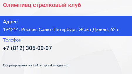 Олимпиец, стрелковый клуб по адресу 194214, Россия, Санкт-Петербург, Жака Дюкло, 62а в дальнейшем Организация, размещена в следующих категориях: