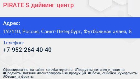 PIRATE`S, дайвинг-центр по адресу 197110, Россия, Санкт-Петербург, Футбольная аллея, 8 в дальнейшем Организация, размещена в следующих категориях: