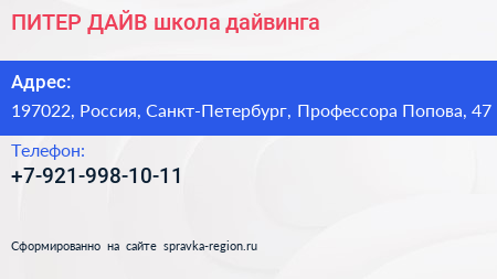 ПИТЕР-ДАЙВ, школа дайвинга по адресу 197022, Россия, Санкт-Петербург, Профессора Попова, 47 в дальнейшем Организация, размещена в следующих категориях: