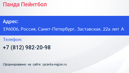 Панда Пейнтбол по адресу 196006, Россия, Санкт-Петербург, Заставская, 22а лит А в дальнейшем Организация, размещена в следующих категориях: