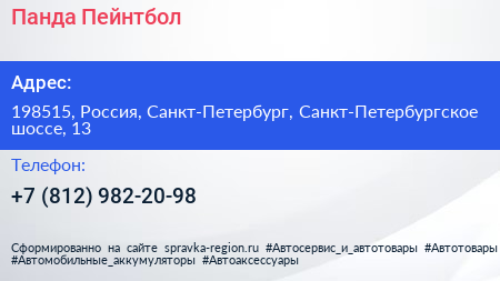 Панда Пейнтбол по адресу 198515, Россия, Санкт-Петербург, Санкт-Петербургское шоссе, 13 в дальнейшем Организация, размещена в следующих категориях: