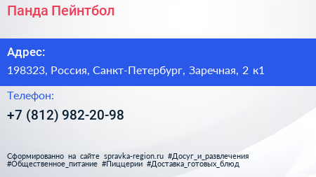 Панда Пейнтбол по адресу 198323, Россия, Санкт-Петербург, Заречная, 2 к1 в дальнейшем Организация, размещена в следующих категориях: