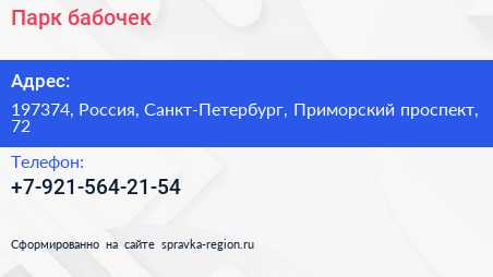 Парк бабочек по адресу 197374, Россия, Санкт-Петербург, Приморский проспект, 72 в дальнейшем Организация, размещена в следующих категориях: