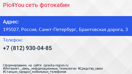 Pic4You, сеть фотокабин по адресу 195027, Россия, Санкт-Петербург, Брантовская дорога, 3 в дальнейшем Организация, размещена в следующих категориях: