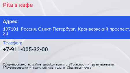 Pita`s, кафе по адресу 197101, Россия, Санкт-Петербург, Кронверкский проспект, 23 в дальнейшем Организация, размещена в следующих категориях:
