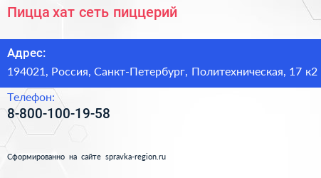 Пицца хат, сеть пиццерий по адресу 194021, Россия, Санкт-Петербург, Политехническая, 17 к2 в дальнейшем Организация, размещена в следующих категориях: