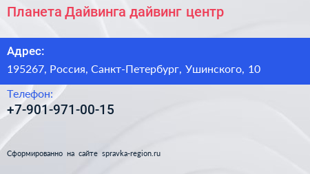 Планета Дайвинга, дайвинг-центр по адресу 195267, Россия, Санкт-Петербург, Ушинского, 10 в дальнейшем Организация, размещена в следующих категориях: