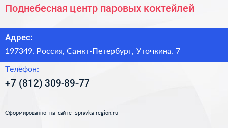 Поднебесная, центр паровых коктейлей по адресу 197349, Россия, Санкт-Петербург, Уточкина, 7 в дальнейшем Организация, размещена в следующих категориях: