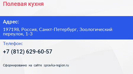 Полевая кухня по адресу 197198, Россия, Санкт-Петербург, Зоологический переулок, 1-3 в дальнейшем Организация, размещена в следующих категориях: