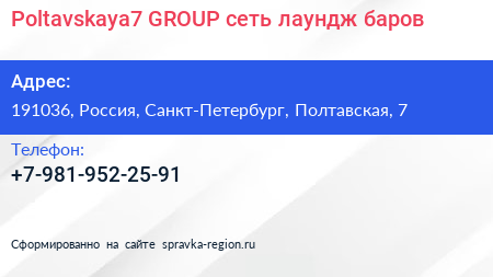 Poltavskaya7 GROUP, сеть лаундж-баров по адресу 191036, Россия, Санкт-Петербург, Полтавская, 7 в дальнейшем Организация, размещена в следующих категориях:
