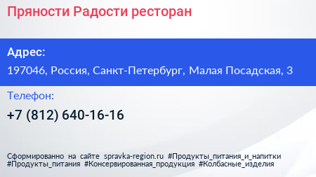 Пряности & Радости, ресторан по адресу 197046, Россия, Санкт-Петербург, Малая Посадская, 3 в дальнейшем Организация, размещена в следующих категориях: