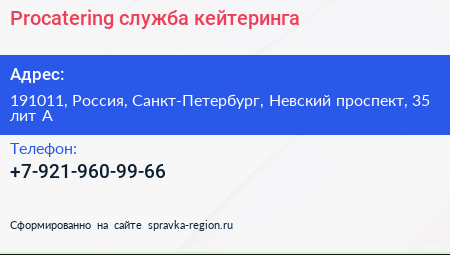 Procatering, служба кейтеринга по адресу 191011, Россия, Санкт-Петербург, Невский проспект, 35 лит А в дальнейшем Организация, размещена в следующих категориях:
