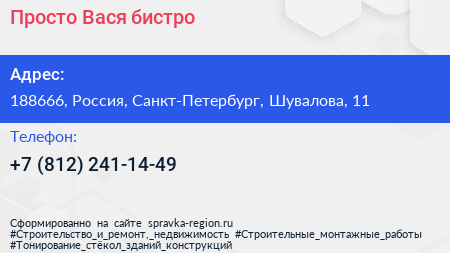 Просто Вася, бистро по адресу 188666, Россия, Санкт-Петербург, Шувалова, 11 в дальнейшем Организация, размещена в следующих категориях: