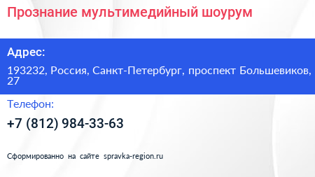 Прознание, мультимедийный шоурум по адресу 193232, Россия, Санкт-Петербург, проспект Большевиков, 27 в дальнейшем Организация, размещена в следующих категориях: