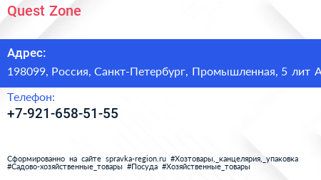 Quest Zone по адресу 198099, Россия, Санкт-Петербург, Промышленная, 5 лит А в дальнейшем Организация, размещена в следующих категориях: