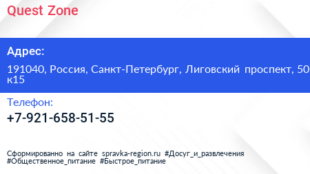 Quest Zone по адресу 191040, Россия, Санкт-Петербург, Лиговский проспект, 50 к15 в дальнейшем Организация, размещена в следующих категориях:
