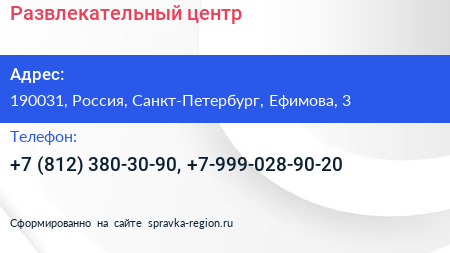 Развлекательный центр по адресу 190031, Россия, Санкт-Петербург, Ефимова, 3 в дальнейшем Организация, размещена в следующих категориях: