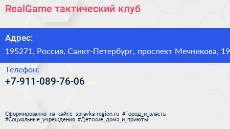 RealGame, тактический клуб по адресу 195271, Россия, Санкт-Петербург, проспект Мечникова, 19 в дальнейшем Организация, размещена в следующих категориях:
