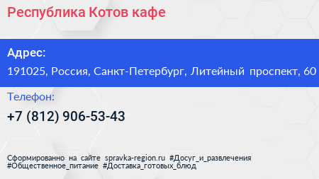 Республика Котов, кафе по адресу 191025, Россия, Санкт-Петербург, Литейный проспект, 60 в дальнейшем Организация, размещена в следующих категориях: