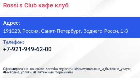 Rossi`s Club, кафе-клуб по адресу 191023, Россия, Санкт-Петербург, Зодчего Росси, 1-3 в дальнейшем Организация, размещена в следующих категориях: