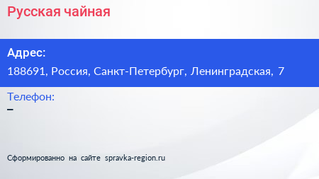 Русская чайная по адресу 188691, Россия, Санкт-Петербург, Ленинградская, 7 в дальнейшем Организация, размещена в следующих категориях: