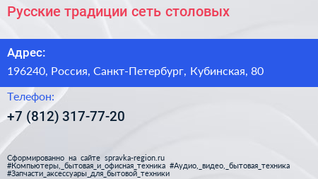 Русские традиции, сеть столовых по адресу 196240, Россия, Санкт-Петербург, Кубинская, 80 в дальнейшем Организация, размещена в следующих категориях: