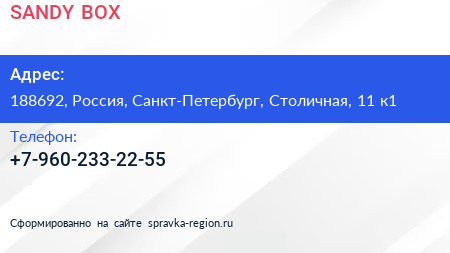 SANDY BOX по адресу 188692, Россия, Санкт-Петербург, Столичная, 11 к1 в дальнейшем Организация, размещена в следующих категориях: