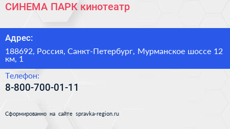 СИНЕМА ПАРК, кинотеатр по адресу 188692, Россия, Санкт-Петербург, Мурманское шоссе 12 км, 1 в дальнейшем Организация, размещена в следующих категориях: