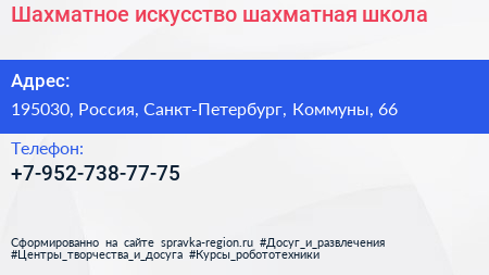Шахматное искусство, шахматная школа по адресу 195030, Россия, Санкт-Петербург, Коммуны, 66 в дальнейшем Организация, размещена в следующих категориях: