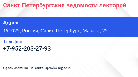 Санкт-Петербургские ведомости, лекторий по адресу 191025, Россия, Санкт-Петербург, Марата, 25 в дальнейшем Организация, размещена в следующих категориях: