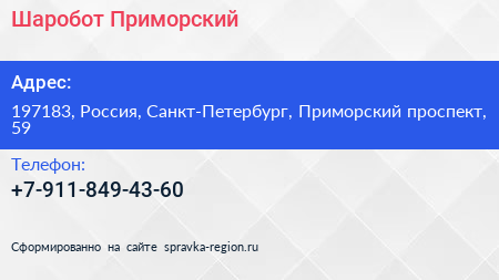 Шаробот Приморский по адресу 197183, Россия, Санкт-Петербург, Приморский проспект, 59 в дальнейшем Организация, размещена в следующих категориях: