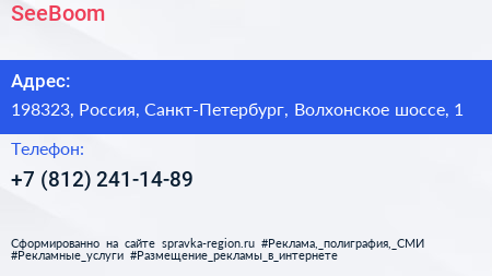 SeeBoom по адресу 198323, Россия, Санкт-Петербург, Волхонское шоссе, 1 в дальнейшем Организация, размещена в следующих категориях:
