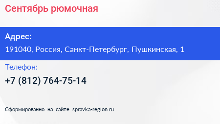 Сентябрь, рюмочная по адресу 191040, Россия, Санкт-Петербург, Пушкинская, 1 в дальнейшем Организация, размещена в следующих категориях: