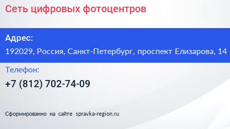 Сеть цифровых фотоцентров по адресу 192029, Россия, Санкт-Петербург, проспект Елизарова, 14 в дальнейшем Организация, размещена в следующих категориях: