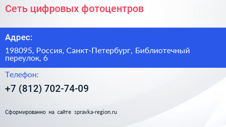 Сеть цифровых фотоцентров по адресу 198095, Россия, Санкт-Петербург, Библиотечный переулок, 6 в дальнейшем Организация, размещена в следующих категориях: