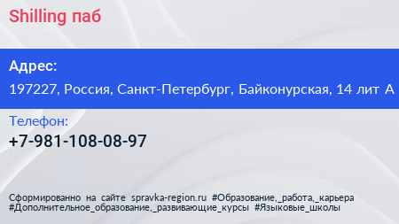 Shilling, паб по адресу 197227, Россия, Санкт-Петербург, Байконурская, 14 лит А в дальнейшем Организация, размещена в следующих категориях: