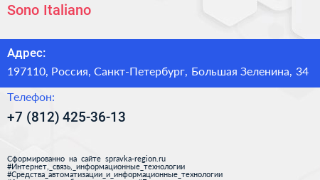 Sono Italiano по адресу 197110, Россия, Санкт-Петербург, Большая Зеленина, 34 в дальнейшем Организация, размещена в следующих категориях: