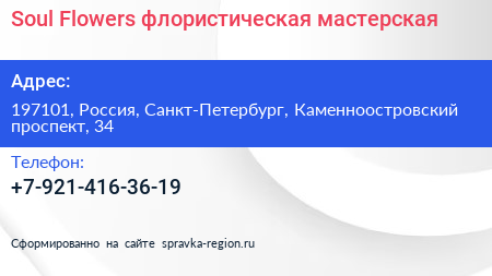 Soul Flowers, флористическая мастерская по адресу 197101, Россия, Санкт-Петербург, Каменноостровский проспект, 34 в дальнейшем Организация, размещена в следующих категориях: