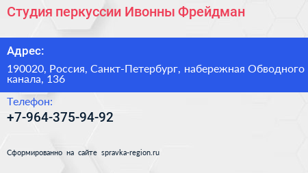Студия перкуссии Ивонны Фрейдман по адресу 190020, Россия, Санкт-Петербург, набережная Обводного канала, 136 в дальнейшем Организация, размещена в следующих категориях: