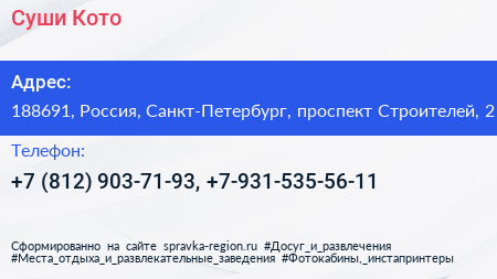 Суши Кото по адресу 188691, Россия, Санкт-Петербург, проспект Строителей, 2 в дальнейшем Организация, размещена в следующих категориях: