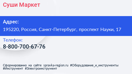 Суши-Маркет по адресу 195220, Россия, Санкт-Петербург, проспект Науки, 17 в дальнейшем Организация, размещена в следующих категориях: