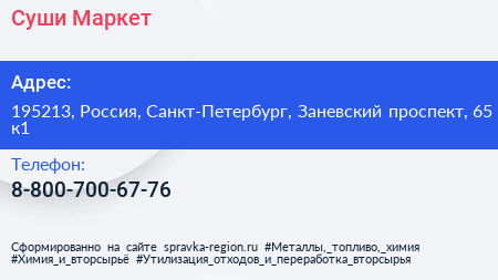 Суши-Маркет по адресу 195213, Россия, Санкт-Петербург, Заневский проспект, 65 к1 в дальнейшем Организация, размещена в следующих категориях: