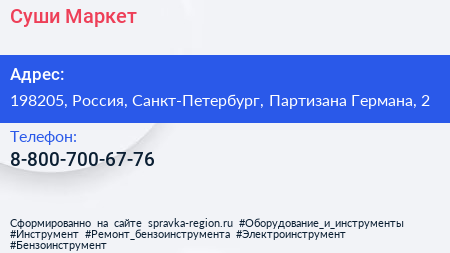 Суши-Маркет по адресу 198205, Россия, Санкт-Петербург, Партизана Германа, 2 в дальнейшем Организация, размещена в следующих категориях: