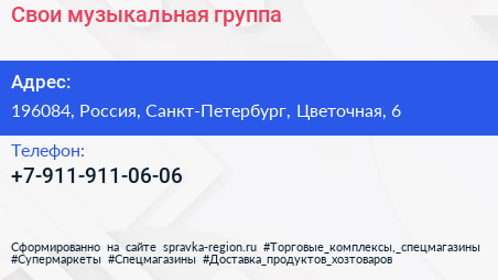 Свои, музыкальная группа по адресу 196084, Россия, Санкт-Петербург, Цветочная, 6 в дальнейшем Организация, размещена в следующих категориях: